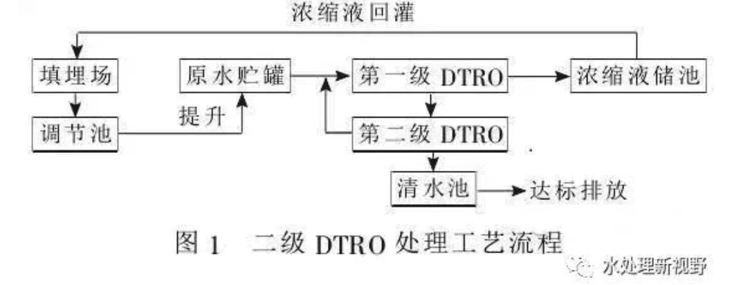 垃圾滲濾液的水質受垃圾成分、降水量、填埋工藝及填埋時間等因素的影響,具有成分復雜、及有機物濃度高、水質變化大等特點,用常規的生化處理方法難以處理達標。與生化法相比,膜分離技術受原水水質變化的影響較小,能夠保持出水水質穩定,用于處理垃圾滲濾液具有明顯的優勢。金正環保采用碟管式反滲透(DTRO)膜處理垃圾滲濾液,其工藝流程如圖: