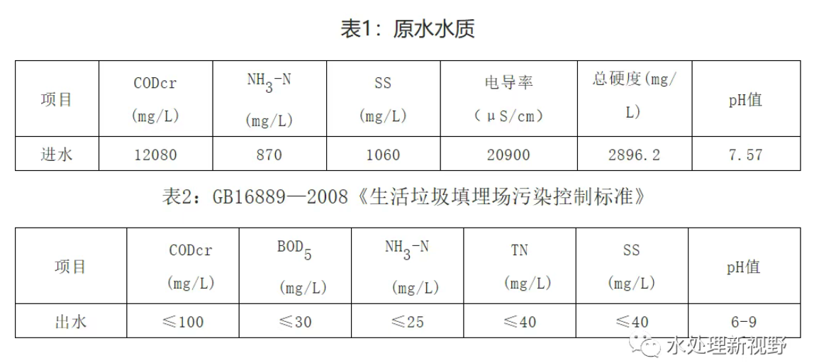 例如:某縣填埋場垃圾主要為居民生活垃圾,根據對該縣人口規模、垃圾收集站的數量及轉運能力的調查分析,確定該工程滲濾液產生規模為100t/d。該填埋場的垃圾滲濾液主要有2個來源,大部分滲濾液是新鮮垃圾在填埋后濾出的,另有一部分是填埋作業面和中間覆蓋面的降雨轉化而來的。滲濾液多為垃圾酸性發酵階段的產物,屬于典型的原生滲濾液,污染物濃度高。本工程設計進、出水水質見表1。出水水質要求達到GB16889—2008《生活垃圾填埋場污染控制標準》表2中規定的排放標準的要求。