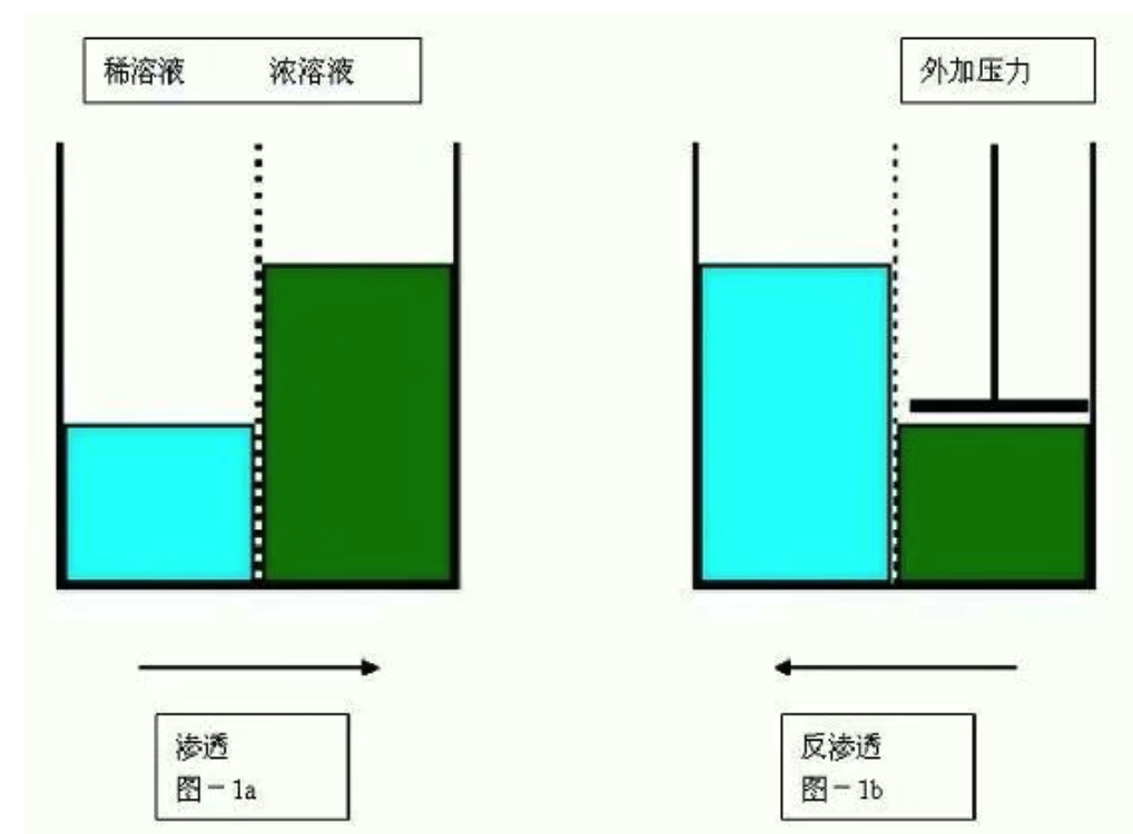 換言之,反滲透除鹽原理,就是在有鹽分的水中(如原水),施以比自然滲透壓力更大的壓力,使?jié)B透向相反方向進(jìn)行,把原水中的水分子壓到膜的另一邊,變成潔凈的水,從而達(dá)到除去水中鹽分的目的。