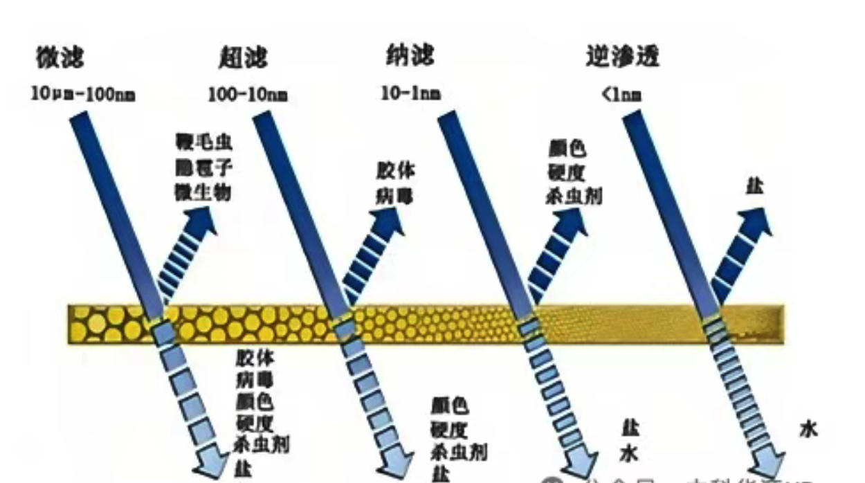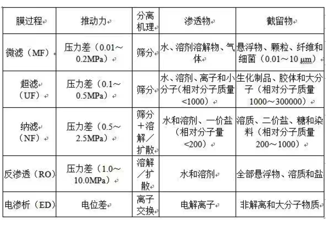 膜分離技術(shù)按照膜的形態(tài)、性質(zhì)、結(jié)構(gòu)以及分離機(jī)理劃分不同。按照分離機(jī)理將膜分離技術(shù)劃分為微濾(MF)、超濾(UF)、納濾(NF)、反滲透(RO)等。