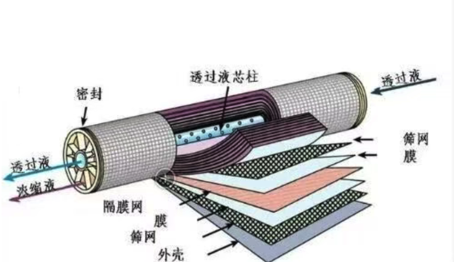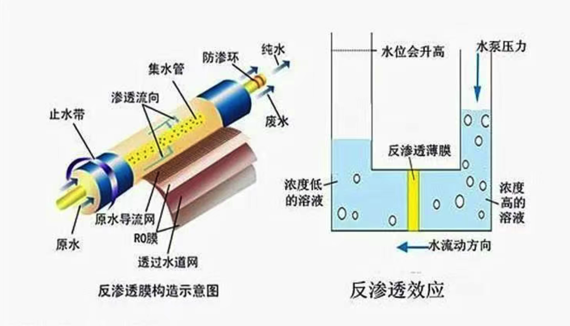 原理是在高于溶液滲透壓的作用下,使其它物質(zhì)不能透過(guò)半透膜而將這些物質(zhì)和水分離開(kāi)來(lái),有效地去除水中的溶解鹽類、膠體、微生物、熱源、有機(jī)物等。