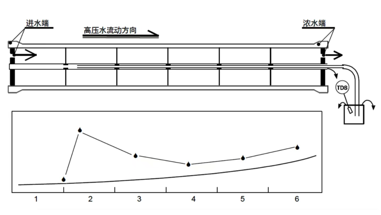 當RO/NF系統以正常操作條件運行時,從壓力容器產水中心管內初始分流出來的水樣是沒有代表性的,應等待幾分鐘,使探測引水管得到沖洗,系統達到平衡,然后從探測管流出來的產水TDS數值可由手持式儀表進行測定,并作數據記錄,它能反映出該位置膜元件的產水TDS值。